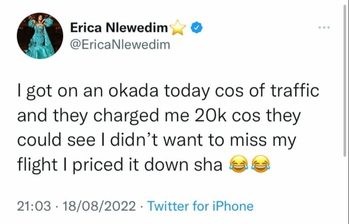 “I got on an okada today cos of traffic and they charged me 20k cos they could see I didn’t want to miss my flight I priced it down sha